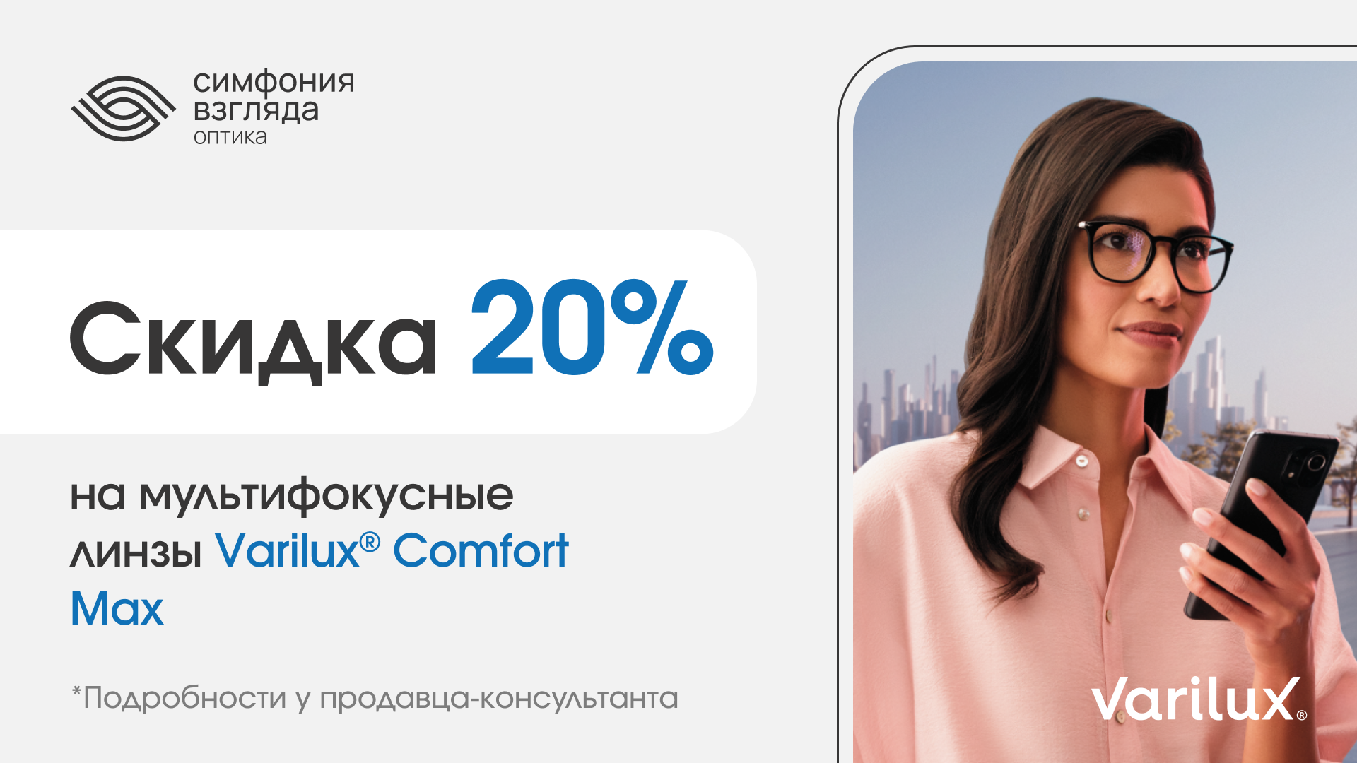 Специальное предложение от оптики «Симфония Взгляда»: покупайте мультифокусные французские линзы Varilux® Comfort Max и наслаждайтесь чётким зрением на всех дистанциях со скидкой 20%!